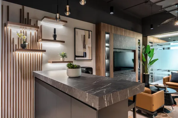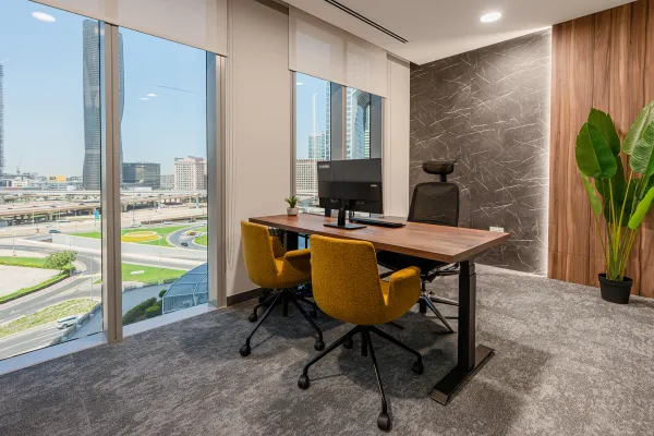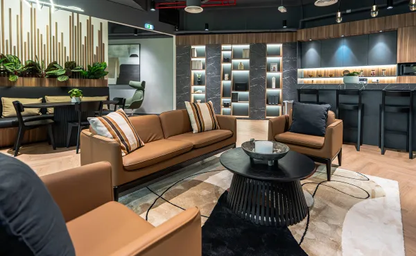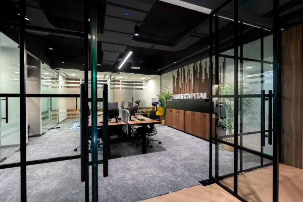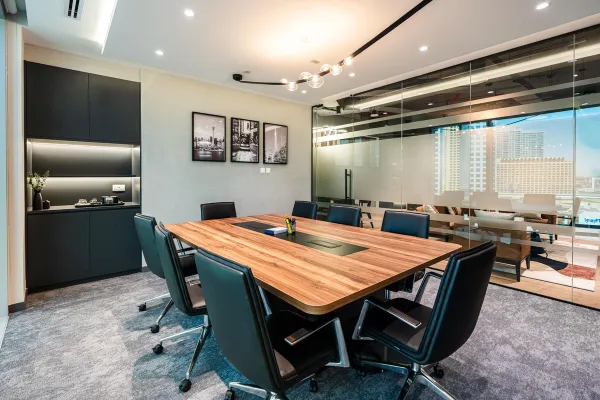 Interior design of bespoke DIFC offices for a Toronto-based developer. A modern, masculine, and refined space with custom furniture, optimized layout, and warm materials like dark wood and camel leather—designed to impress and welcome an international clientele.