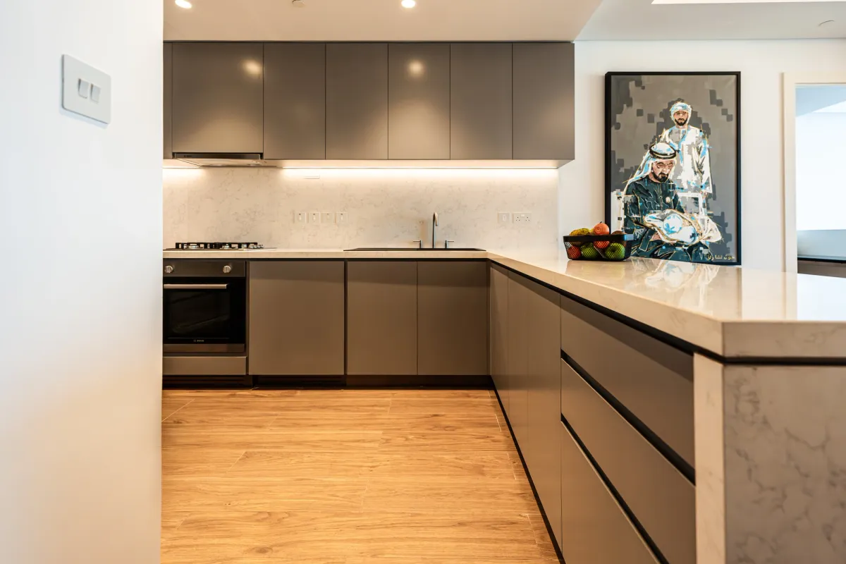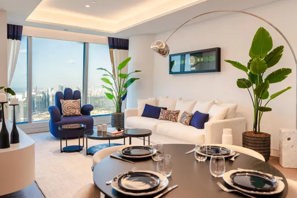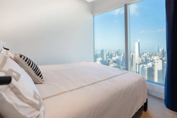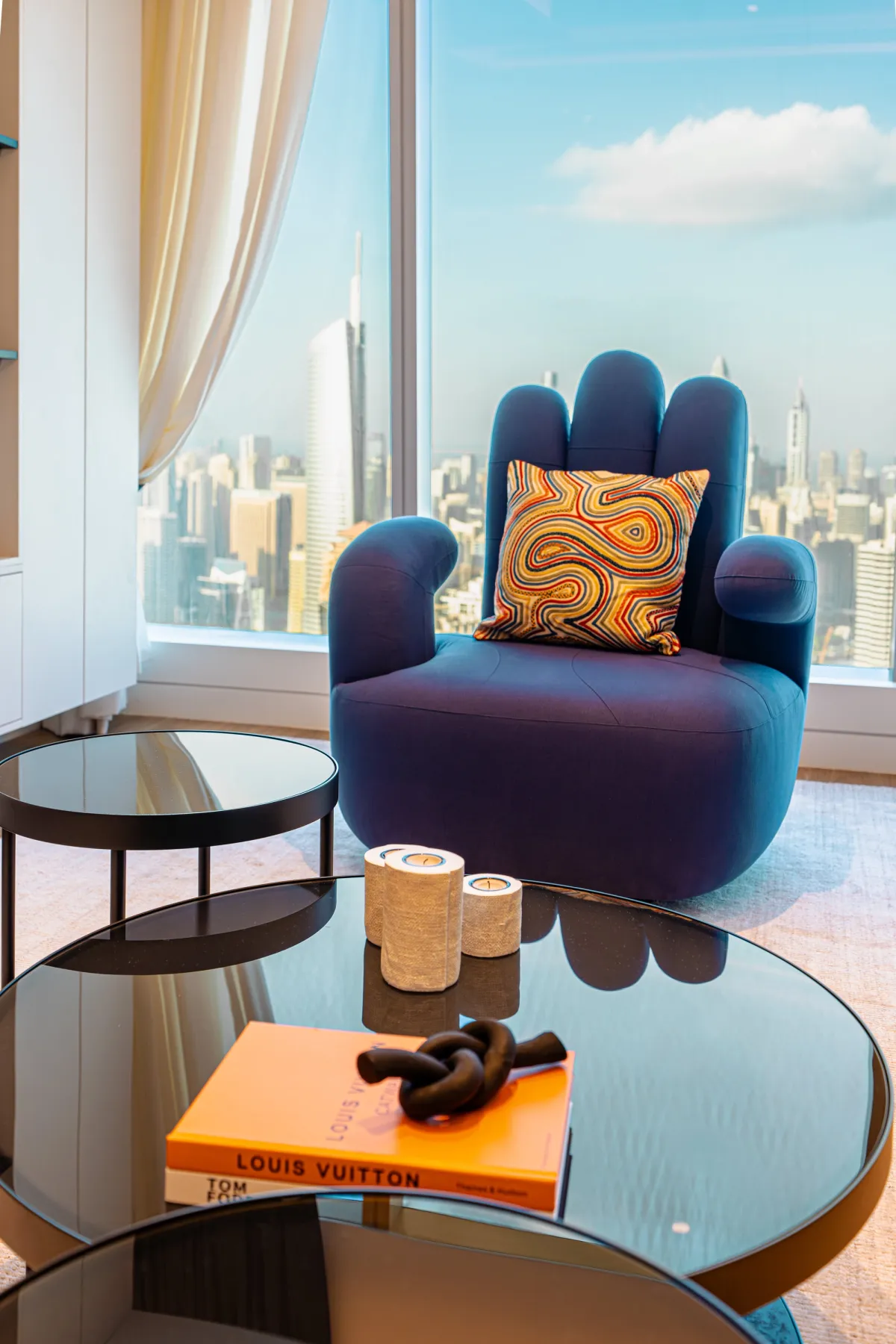 On the 53rd floor of Uptown Tower, we designed a bold, personalized apartment with panoramic views. Highlights include a plexiglass case for a signed boxing belt, a hand-shaped swivel chair, and a bed facing the skyline—merging art, design, and emotion.